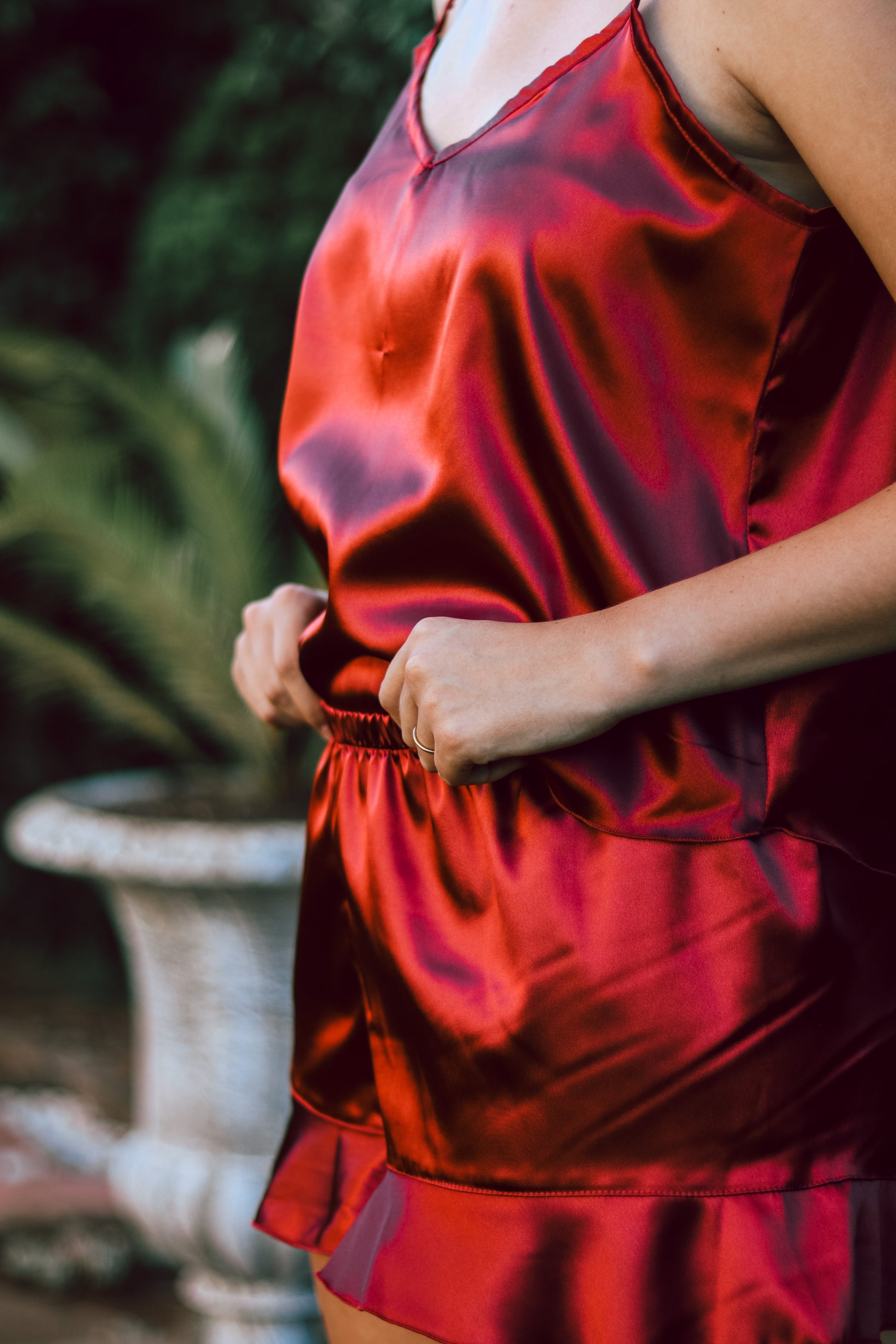 Make a bold statement with our Red Satin Ruffle Camisole and Shorts Set, a luxurious sleepwear ensemble that radiates confidence, passion, and timeless glamour. This stunning two-piece set features a flattering V-neck camisole paired with delicately ruffled shorts in a rich, vibrant red that commands attention and exudes sophistication.