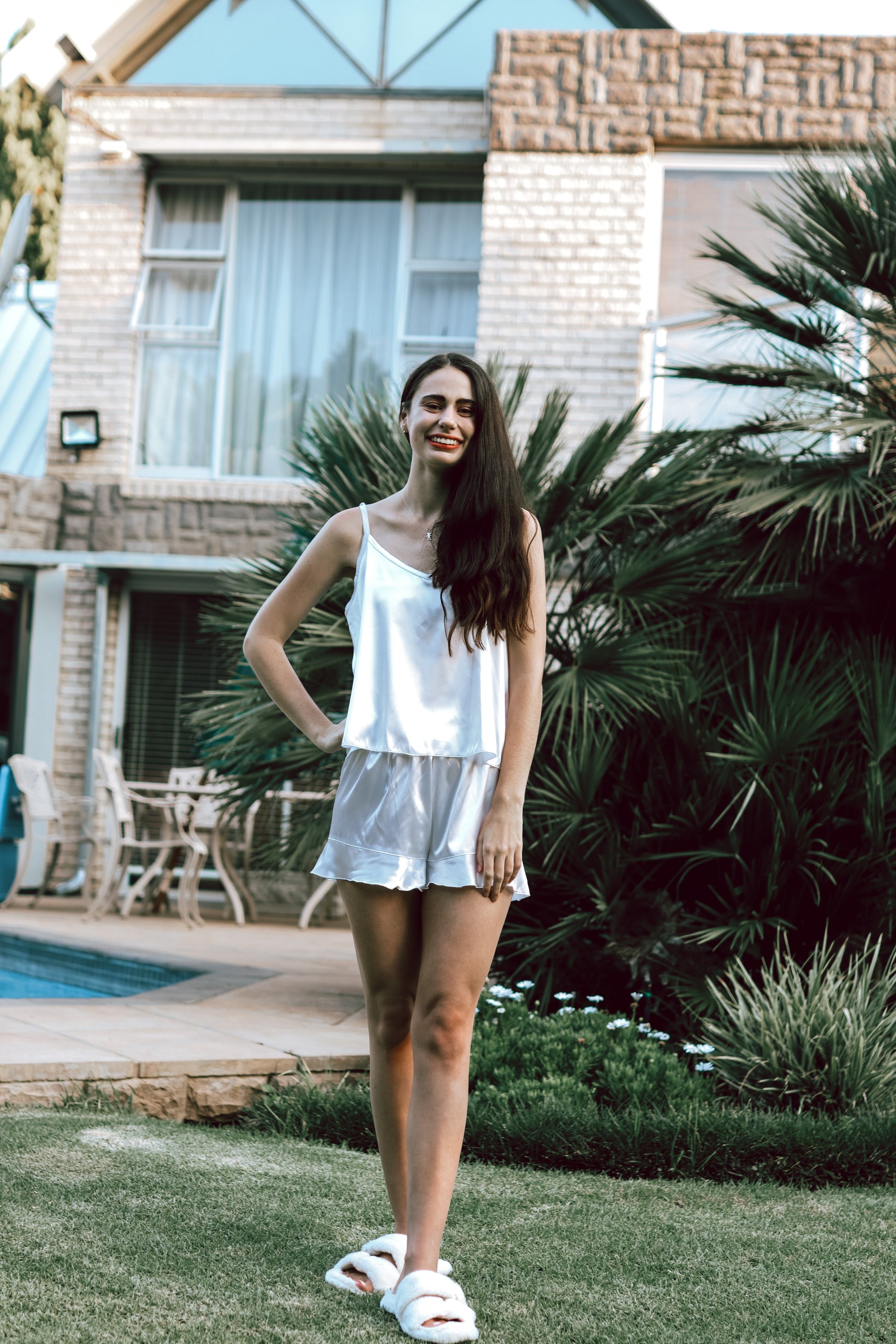 Indulge in effortless elegance with our White Satin Ruffle Camisole and Shorts Set, designed for the modern bride who values comfort and sophistication. This luxurious two-piece sleepwear set features a flattering V-neck camisole paired with delicately ruffled shorts, crafted from premium satin that drapes beautifully and feels divine against your skin.
